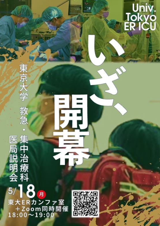 MESSAGE 私たち救急・集中治療科では、緊急での対応が必要な方や、重篤な病態で集中治療を要する方への診療を行なっています。また院内で発生した急病人に対してもすぐさま駆けつけ対応したり、災害に対する計画を立てたりと、病院・地域の危機管理にも携わっています。 緊急度と重症度の高い患者さんを救うべく、東大病院の最後の砦として機能することが期待されており、このような多岐にわたる診療活動について、昼夜を問わず担当しています。 救急・集中治療科では24時間365日、東大病院、そして地域全体のみなさんの健康を維持するために、質の高い医療を提供できるよう、One Teamで診療を行ってまいります。 ご挨拶 各設備の紹介FACILITY 救急外来と、救命ICU・救急病棟からなる救命救急センター、術後や重症の患者さんが入院する第1、第2ICU(成人ICU)のご紹介です。 後期研修についてFOR RESIDENTS 東大病院救急・集中治療科での研修では、救急外来はもちろん、集中治療にも携われます。当科の後期研修は、当科を基幹病院とした「東京大学救急・集中治療科総合研修プログラム」のもと行います。 研究協力のお願いRESEARCH COOPERATION REQUEST 当科に入院された方について、オプトアウトを用いた臨床研究のお知らせとご協力のお願いです。 WHAT’S NEW ALL TOPICS 教育・研修関連 業績関連 研究関連 417 Friday 教育・研修関連  2026.04.09 【救急・集中治療科医局説明会】集中治療をしっかり学びたい方へ 2027年度も専攻医募集中! 説明会を開催します(現地およびオンライン)。 初期研修医、救急・集中治療に興味がある先生のご参加をお待ちしております。 TOPICS  2026.04.09 集中治療学会で放映された動画 2026年3月5日から7日に開催された日本集中治療医学会学術集会のセクションの間で放映された動画を紹介します。この動画は東京大学病院をメインに撮影されました。救急・集中治療分... 業績関連  2026.02.16 論文掲載のお知らせ 2026年になり当科から既に7つの論文が発表されています。引き続き当科では臨床と研究ともに鋭意努力します! 詳細は こちら をご確認ください。 TOPICS  2025.10.04 鉄門旅行 毎年開催される東京大学医学部生との旅行に当科から永井先生、徳地先生、濱田先生が参加してくれました。 業績関連  2025.09.20 日本急性血液浄化学会学術集会 日本急性血液浄化学会で中野秀比古先生がBest presentation awardを受賞しました。 演題:「CRRT施行AKI患者における血液検査の経時変化パターンと死亡率... 研究関連  2025.09.02 「重症患者における急性腎障害の疫学:国際共同後ろ向き観察研究」へのご協力のお願い 研究協力のお願いです。 詳細は こちら をご確認ください。 業績関連  2025.08.30 日本呼吸療法医学会学術集会 日本呼吸療法医学会で高井大輔先生が優秀演題賞を受賞しました。 演題:「肺移植術後の早期におけるEITを用いた換気血流ミスマッチ評価 -片肺移植と両肺移植の比較-」 新着情報一覧